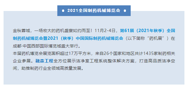 第61屆(2021年秋季)全國(guó)制藥機(jī)械博覽會(huì)于2021年11月4日在中國(guó)西部世界博覽城圓滿落下帷幕。感謝蒞臨融森工程的每一位客戶朋友,2022天津我們?cè)贂?huì)!